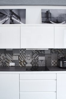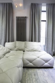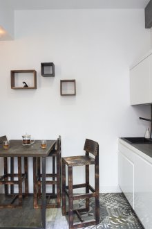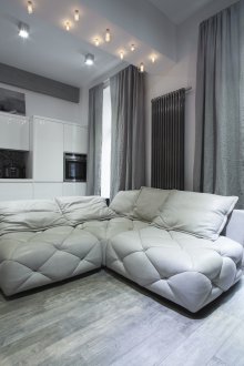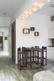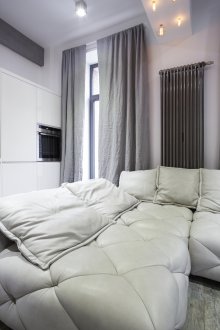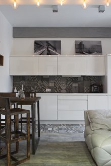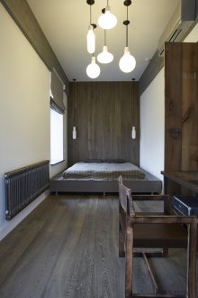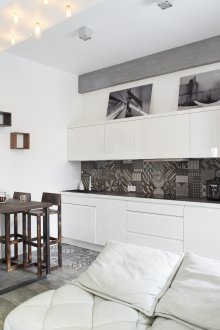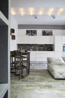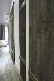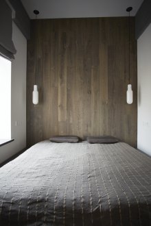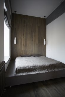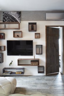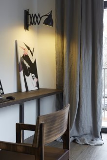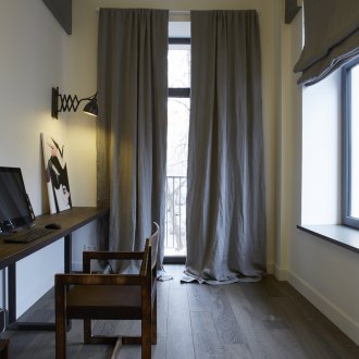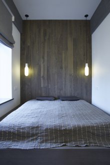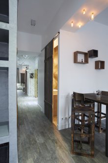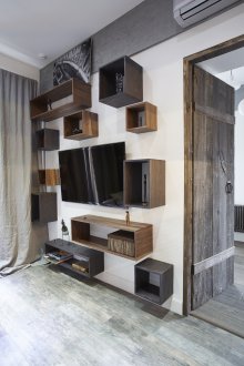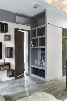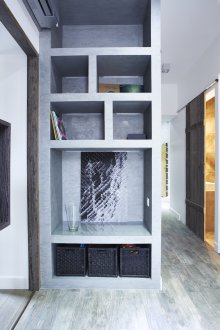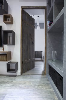 מהרגעים הראשונים של הדיון התאהבתי בפרויקט הזה. דומה מאוד לדעותיהם ורעיונותיהם של החבר'ה, הנכונות להתנסות ו"לא בז '"שיחד אותי. פנים דיסקרטי, אכזרי. עץ פלוס מלך הפרחים - אפור, מרקם בטון ולבן כרקע. הבית עצמו היה מרוהט מאוד לסגנון זה - תקרות גבוהות של 3.40 מ ', חלונות ברצפה, חזית מעוצבת מאוד מסוגנן ושטחים משותפים פנימיים. כל שנותר היה לפטר את החלל הקטן בצורה הגיונית וארגונומית ככל האפשר. כתוצאה מכך, הוקצה אזור סלון עם מטבח, חדר הלבשה הוסתר מאחורי דלת עץ ישנה מול חדר האמבטיה, ובוצעו 2 אזורים בחדר השינה - פינת שינה (מיטה בכל רוחב החדר) ופינת עבודה. כמו כן, לבקשת הלקוחות, הוצבו מדפים רבים - קוביות סביב הטלוויזיה ויחידת מדפים מובנית בקיר.