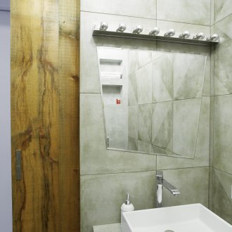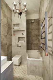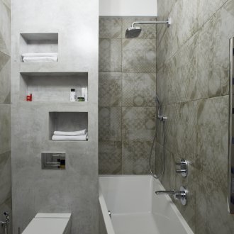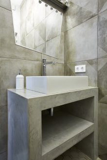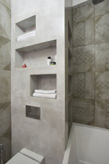 במחצית השנייה, מלבד האריחים, השתמשנו בחומר מעניין מאוד, מיקרוסמנט, שעיבד את הארון שנעשה על ידי הבונים במו ידיהם מתחת לכיור ואת המדפים המובנים בקיר.