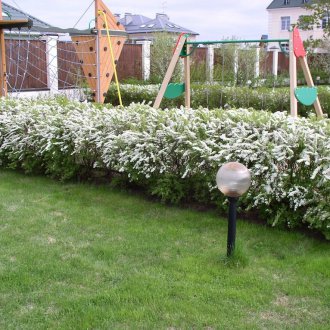 Trapez şeklinde bir kenar boyunca bir çit dikilebilir ve ev ve onun arasında bir oyun alanı düzenlenebilir.