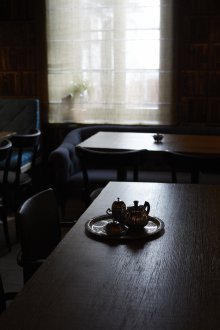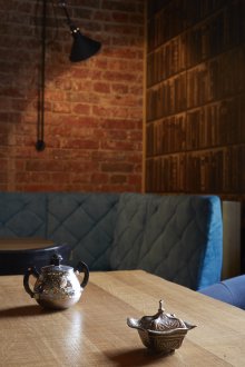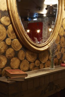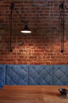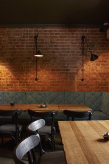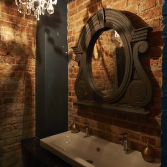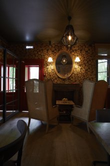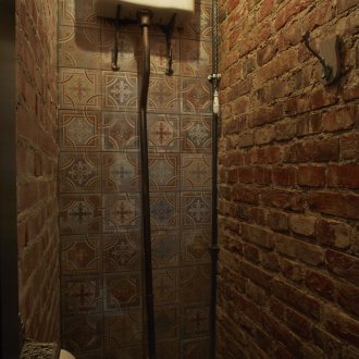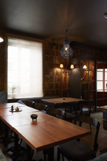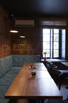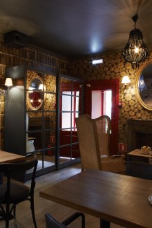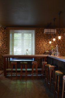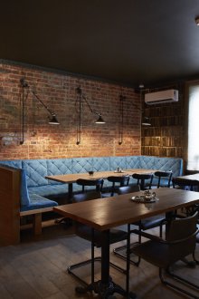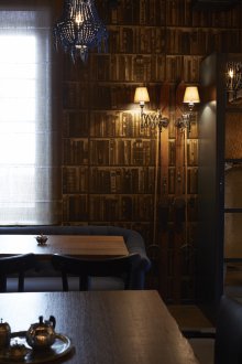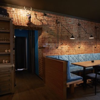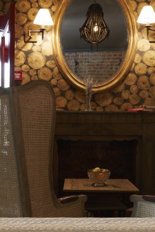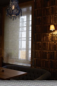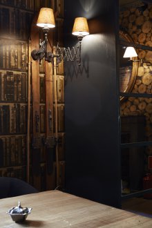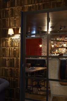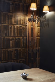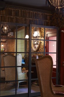 Bu iç mekanın fikri, bu küçük odada bazı lisans köpek kulübesinin bir oda atmosferi veya daha doğrusu bir adamın kendisiyle yalnız zaman geçirdiği veya viski içmek veya çok önemli iş görüşmeleri yapmak için yakın arkadaşlarla bir şirketle buluştuğu bir ofis yaratmaktı. Doğaçlama bir şöminenin yanında iki kişilik rahat bir iniş var, ayrıca bir şirketle kanepelere rahatça oturabilir ve barda bir bardağın arkasına ya da mermer tezgahlı tekerleklerin üzerinde yüksek bir masaya oturabilirsiniz.